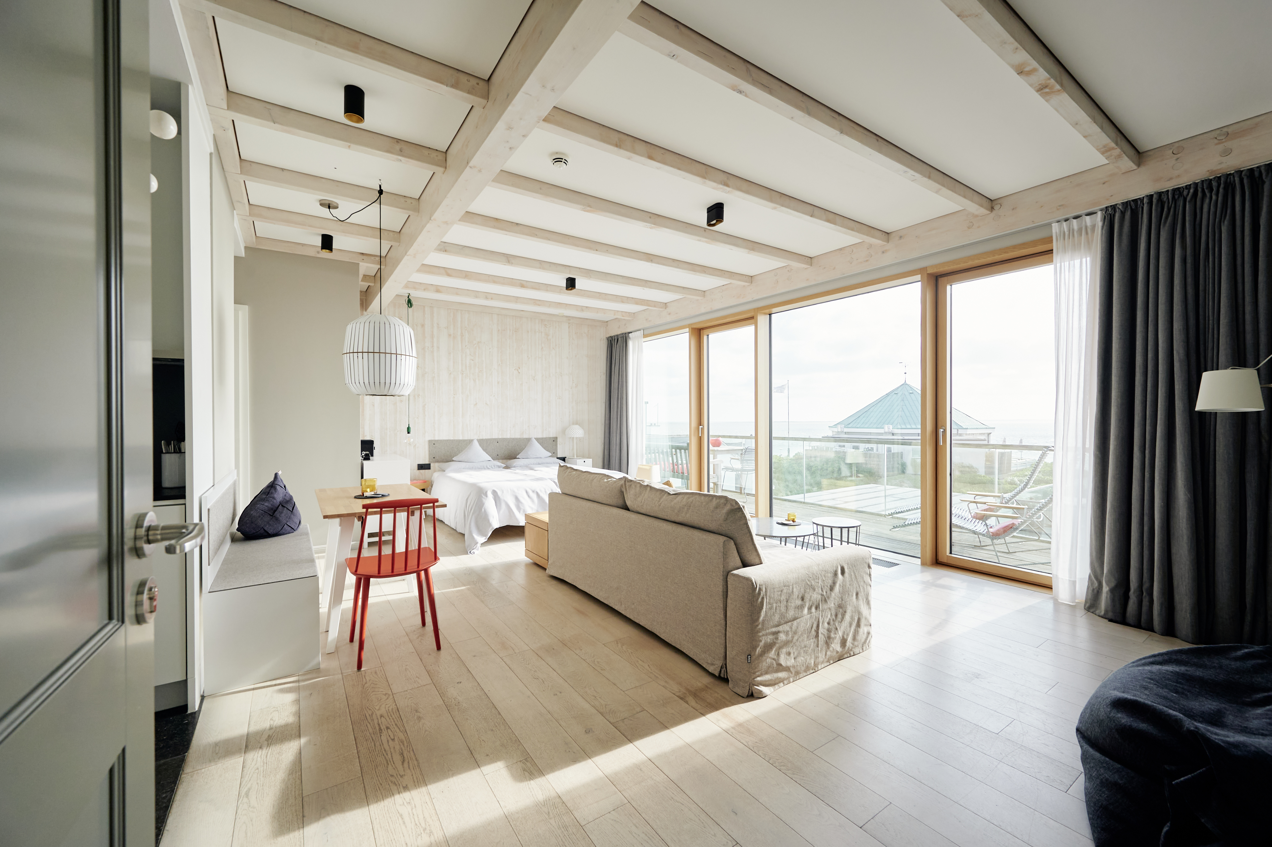 Frei entscheiden – jeden Tag neu. Das Inselloft bietet eine Spielwiese, einen Baukasten an Optionen. Bau Dir Deinen perfekten Tag selbst zusammen – zwischen Stille am Strand und der Lebendigkeit eines Hotels. Besuch den eigenen Spa, das Gym, cruise mit den Inselloft-Fahrrädern über die Insel, stöber im Brune Design Shop oder gönn Dir ein Teilchen in der hauseigenen Bäckerei. In den Zimmern trifft belgischer Blaustein auf sägeraues Holz und neon-orange von Tom Dixon auf Zickzack von Missoni. Zimmerlange Glasfronten im Penthouse geben den Blick auf die Nordsee frei, in den Lofts punkten Zimmerhöhen bis zu 3 m.