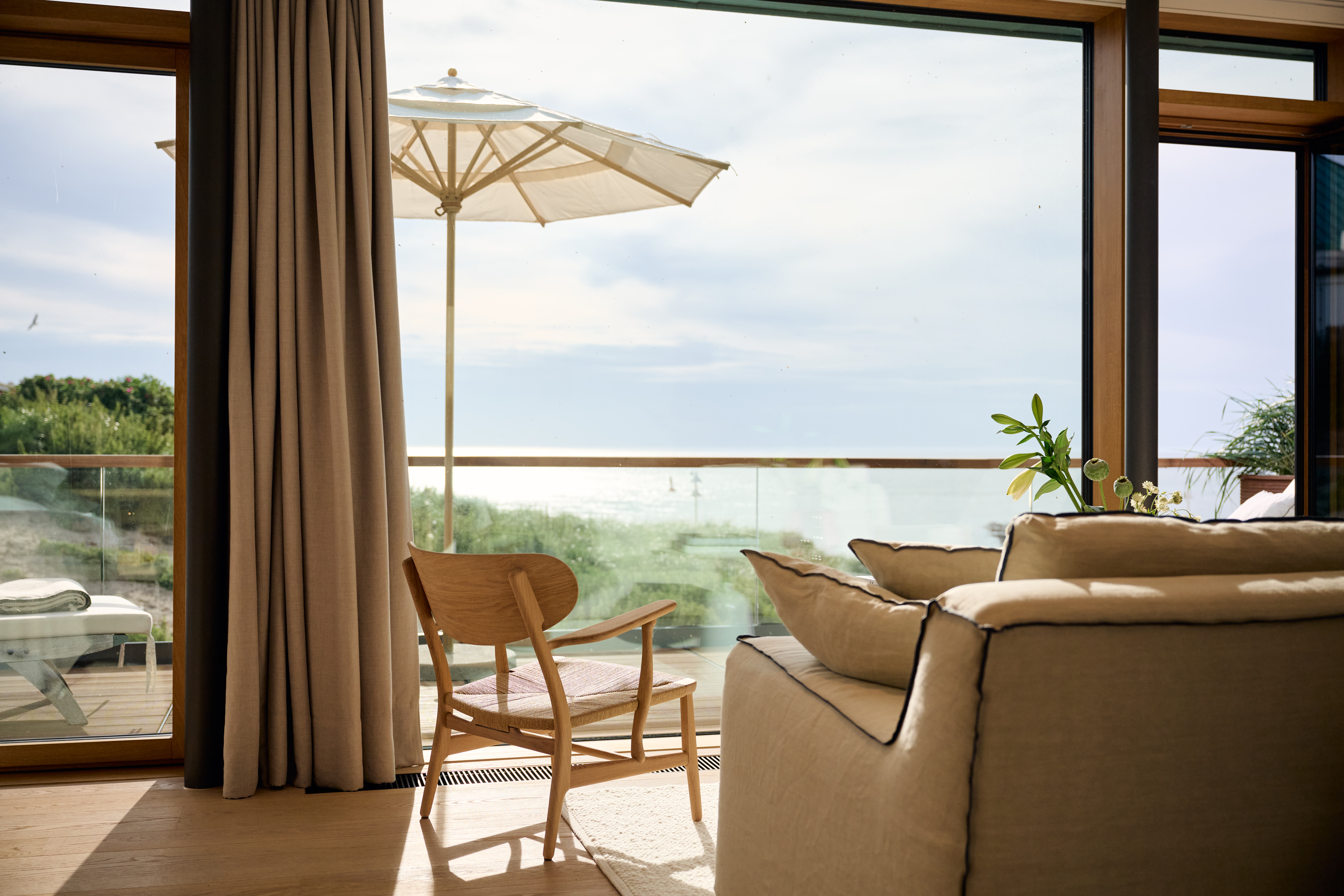 Atemberaubende Ausblicke aufs Meer aus bodentiefen Panoramafenstern. Wohlige Wärme an der Kaminbar oder in der Seeveranda nach Strandspaziergang, Sauna und Schwimmbad. Ein Liegestuhl mit Wolldecke auf der eigenen Seeterrasse, den kräftigen Nordseewind im Gesicht.